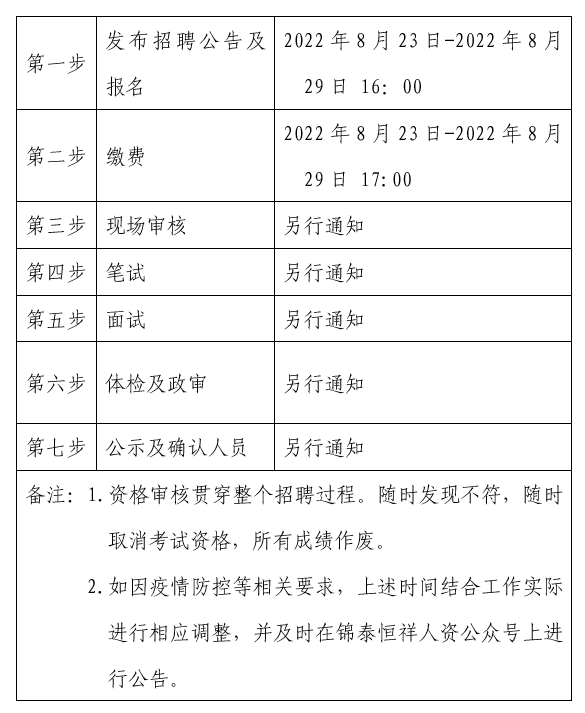 ?2022年8月23日-2022年8月29日 16:00在錦泰恒祥人資官網(wǎng)(www.jthxhr.com)、“錦泰恒祥人資”微信公眾號、“國控集團”官方網(wǎng)站(m.jskzz.cn)及上級部門要求的相關(guān)網(wǎng)站等發(fā)布招聘公告。