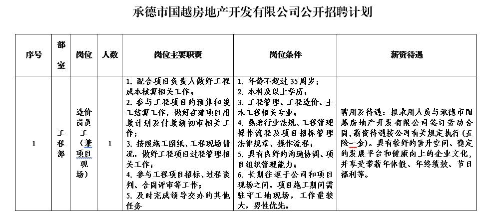 本次擬招聘1個崗位共計1人。具體應(yīng)聘條件見附件《承德市國越房地產(chǎn)開發(fā)有限公司公開招聘計劃表》 。