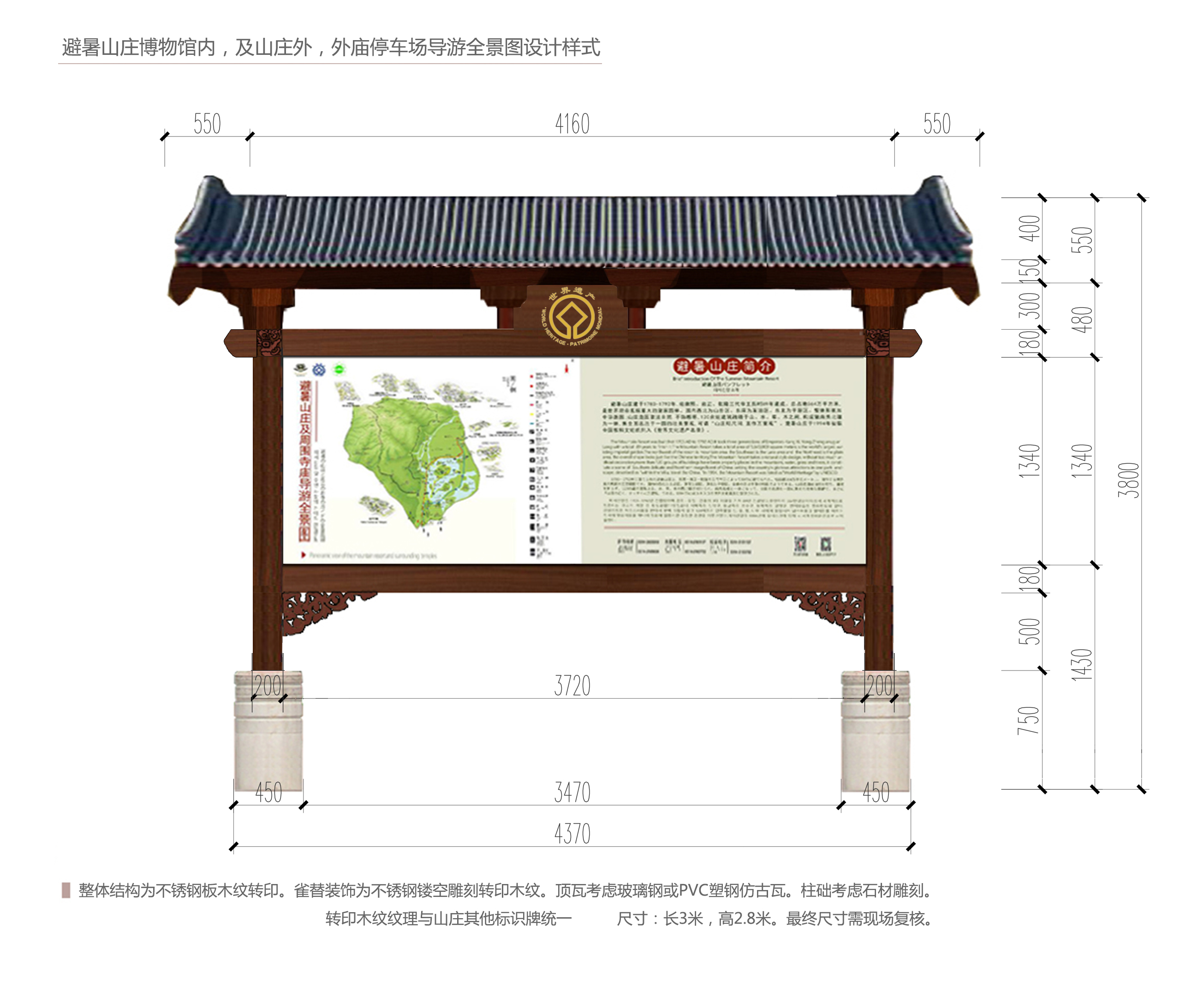 按照承德市人民政府辦公室印發(fā)的《避暑山莊及周圍寺廟景區(qū)整改提升專項工作方案》要求,在避暑山莊及周圍寺廟外5個停車場內(nèi),各設(shè)置景區(qū)導(dǎo)游全景圖1塊,由我公司邀請有資質(zhì)的單位進行制作和施工,現(xiàn)將有關(guān)事項通知如下: